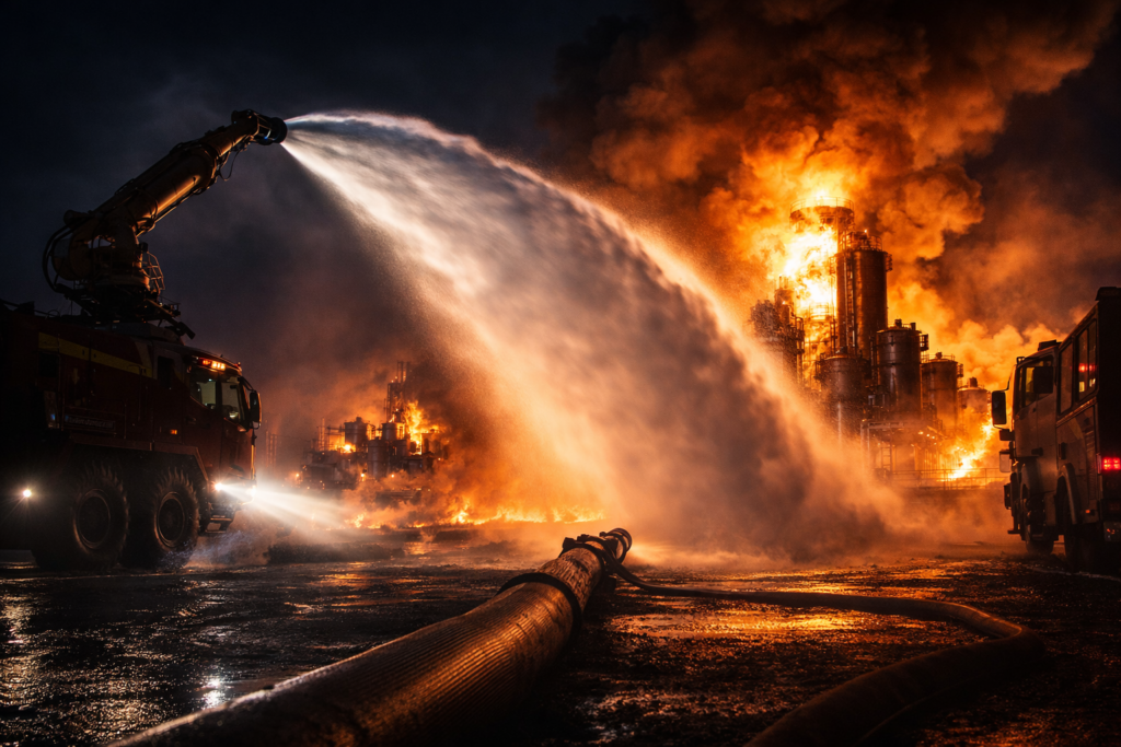一方、石油コンビナートや大型化学プラント火災では、都市火災とは必要な戦術が根本的に異なる。可燃性液体の大量燃焼は発熱量が桁違いで、熱・輻射・再燃のリスクも大きい。そのため、面を覆う泡の展開速度と密度が勝負になる。